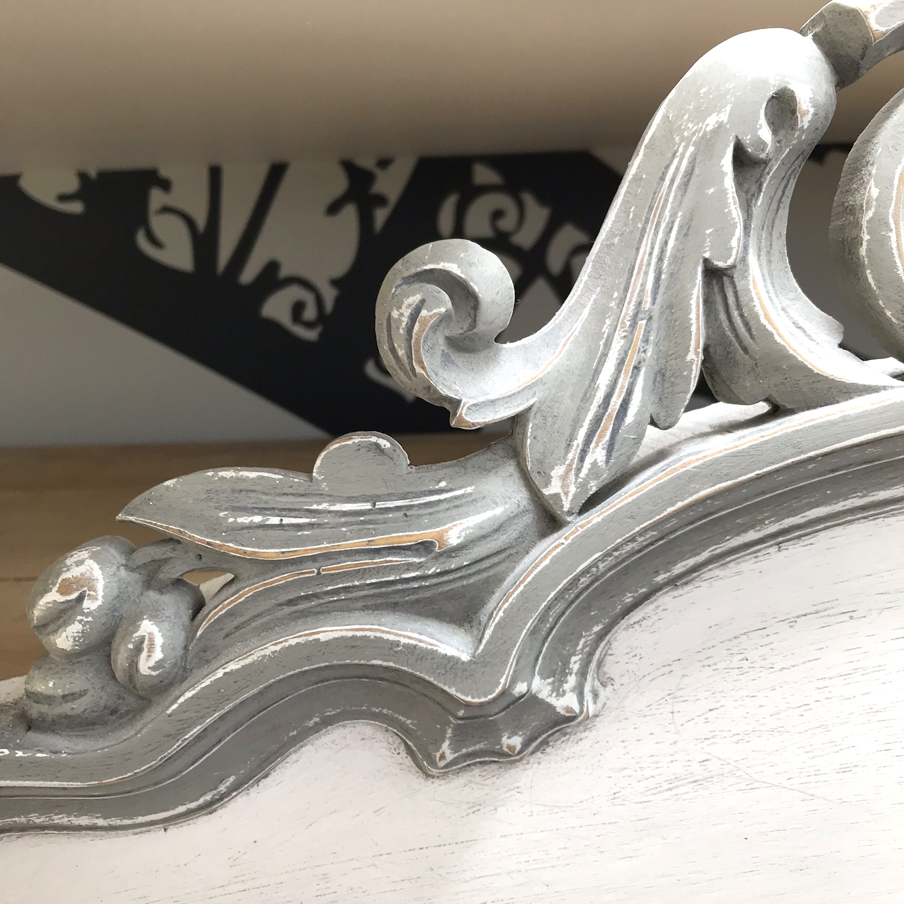 Quel magnifique! Revel in this gorgeous antique French Armoire – painted in a chic shade of white with grey painted detailing. This fabulously stylish wardrobe has a lovely carved pediment and ample storage space, including a bottom drawer, its interior painted an antique shade of green.
