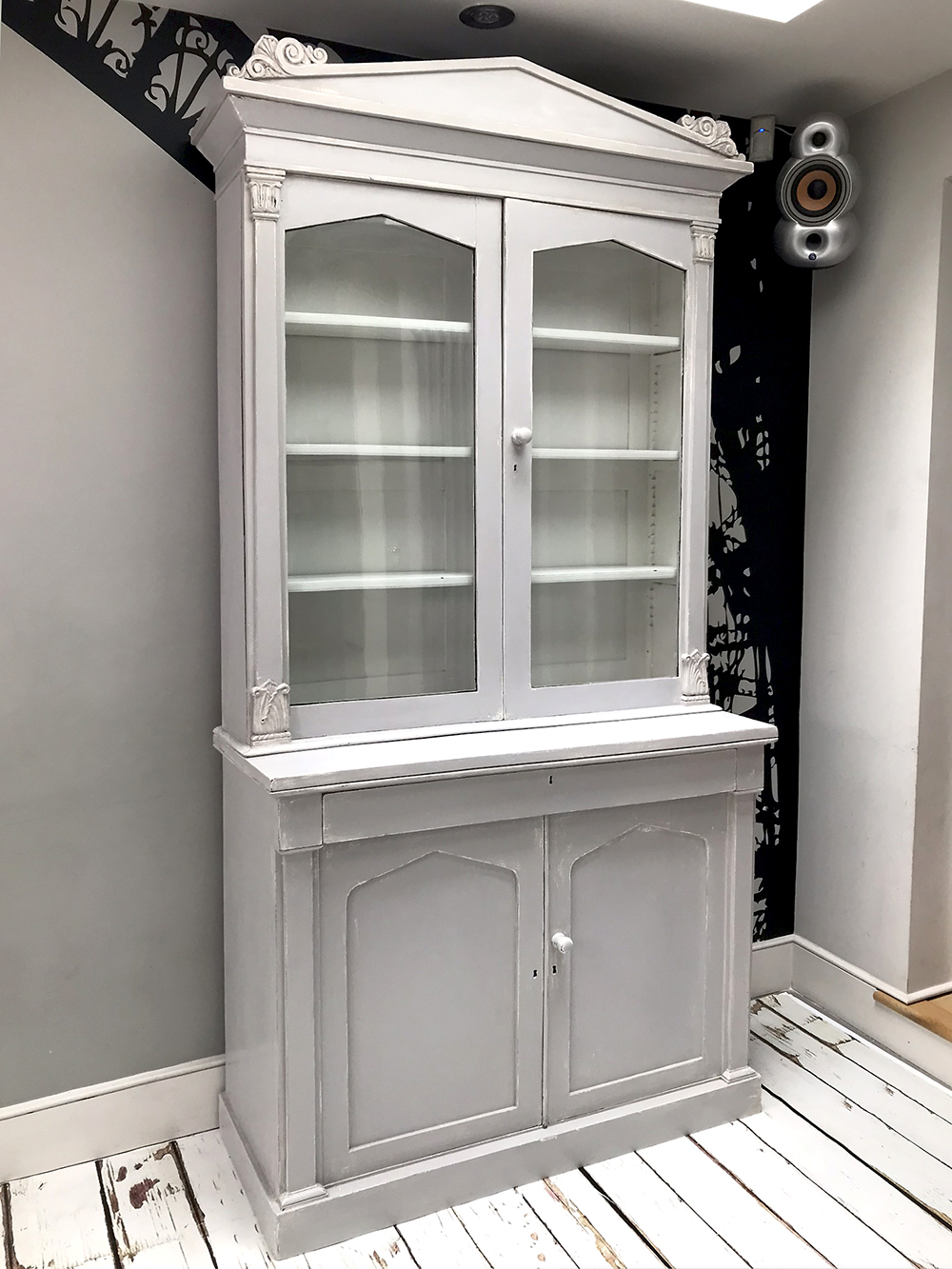 Painted in a fashionable light grey chalk paint, this antique piece has been lightly distressed to reveal glimpses of a complimentary shade of white paint underneath. The top glass fronted section (which comes apart from the base for easy movability) has a white painted interior, and the bottom cupboard has finished in an on trend Prussian blue, sealed with wax for durability.