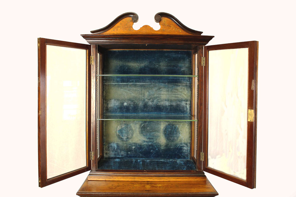 Beautiful antique rosewood Victorian glass fronted display cabinet on delicate tapered legs in original untouched state with lovely floral inlay patterns and classical carved shape. This period piece would make an attractive addition to your bedroom, lounge or bathroom. With two shelves and two wide drawers there’s plenty of space to store those special knick knacks, glassware, toiletries or linen.