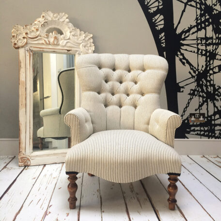 Add some vintage style glamour to your lounge or bedroom with this traditional striped ticking armchair. Upholstered in a classic black and white striped cotton drill fabric* and finished with a gothic black lace trim at the back, this chair makes a stylish statement for the modern home.