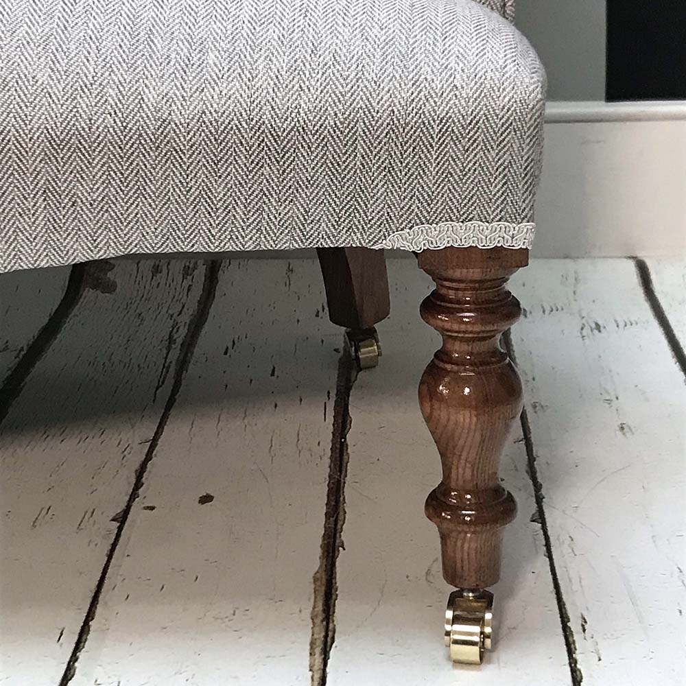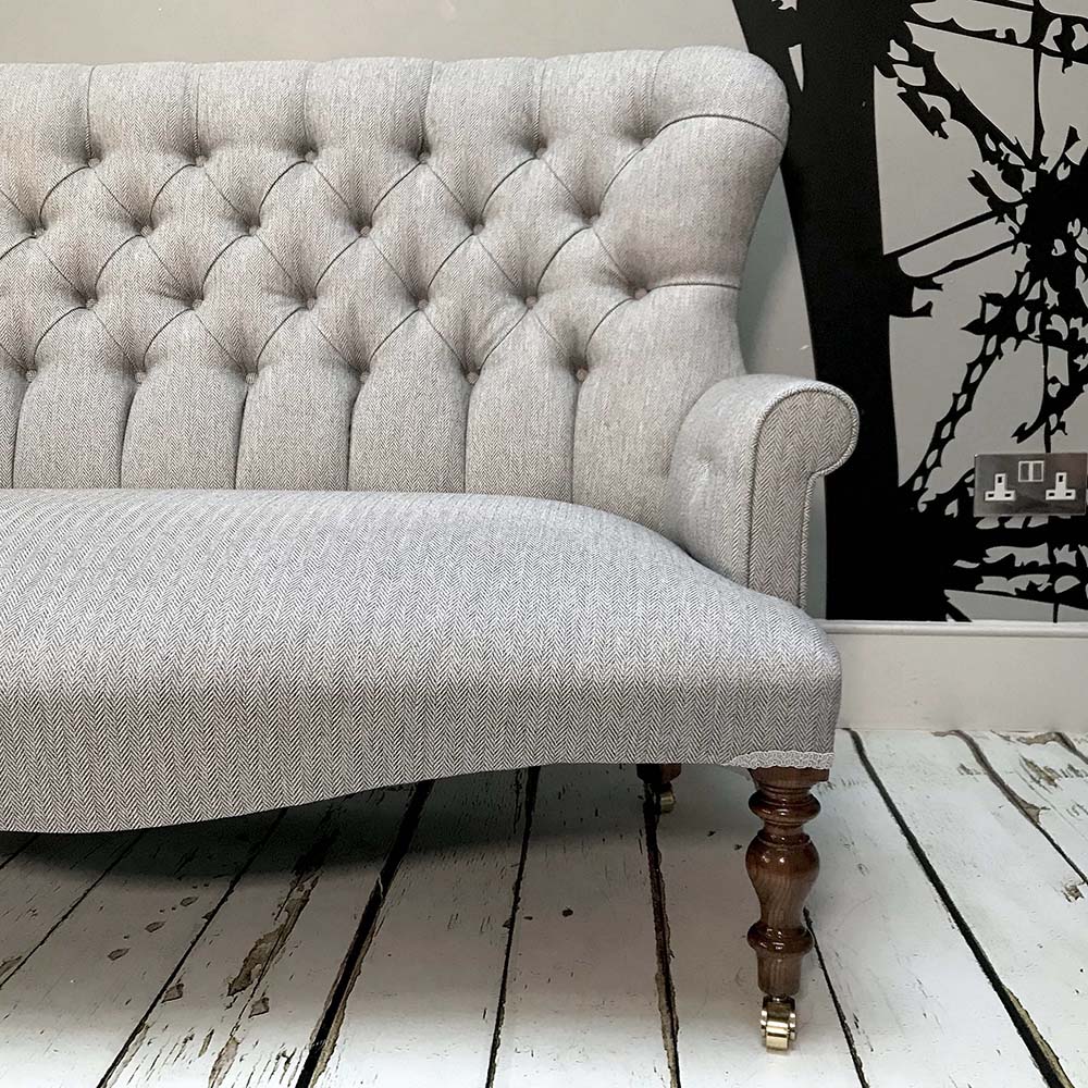 Meet Poirot light grey double sofa, a timeless silver fox that will add oodles of style to your interior space! Attractive buttoned back sofa in grey herringbone, matched here with short mahogany brown legs. (Option to have short legs or longer legged version – see Heathcliff Sofa, with or without castors).