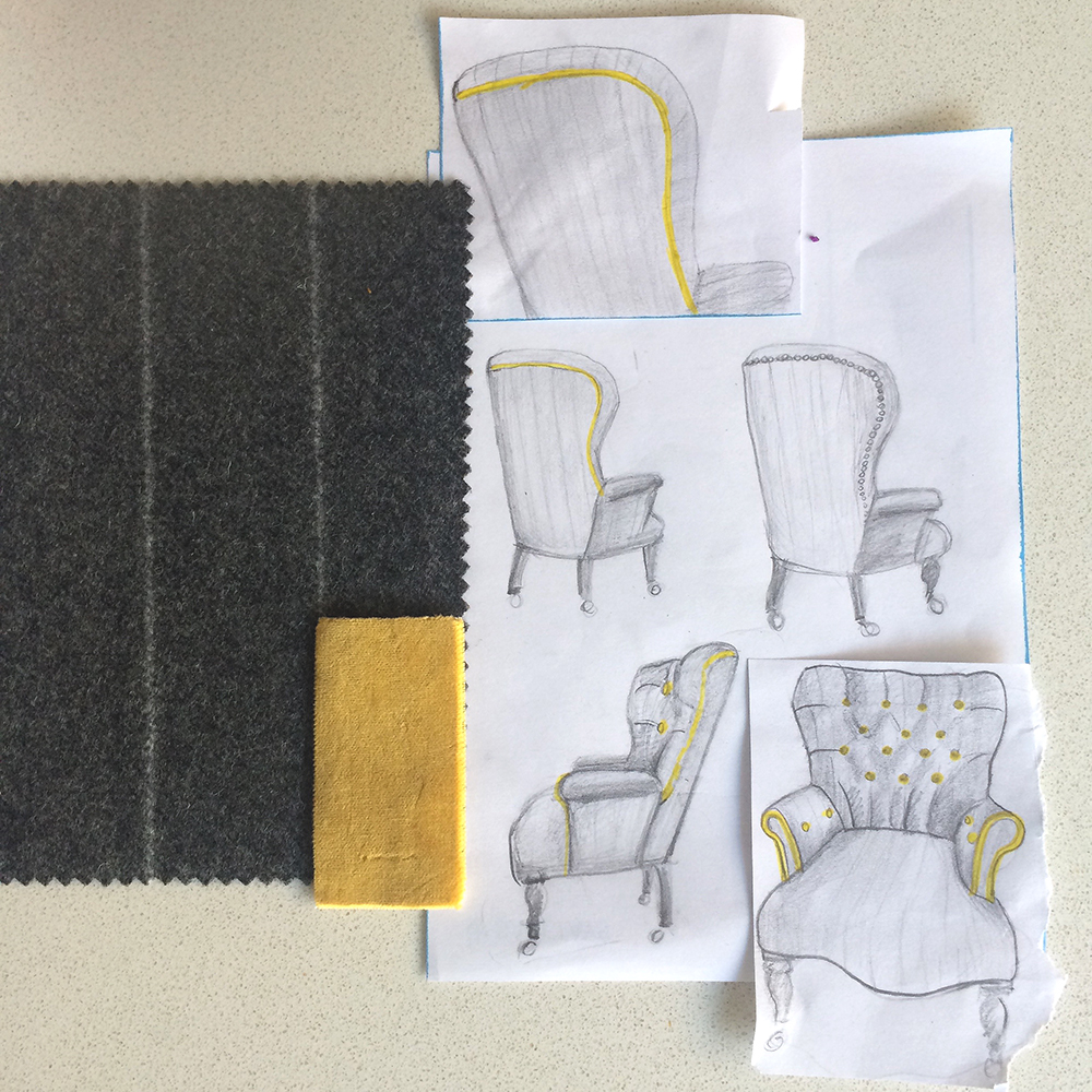 Deciding on fabric and colour combinations can be tricky – and there’s only one way to really see what your idea is going to look like, simply sketch it out! The idea here is that the wide grey pinstripe will be the lead fabric, with small touches of piping and buttons in yellow velvet to give a little lift.